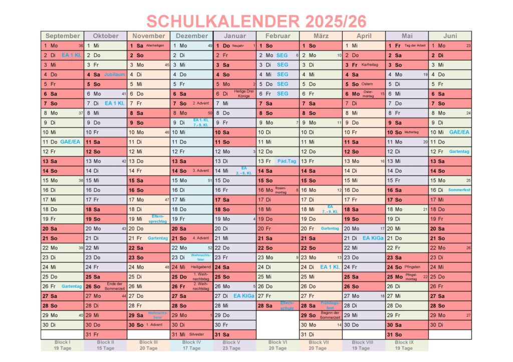 Sie finden die diesjährigen Termine von Schule und Kindergarten auf unserem Kalender.