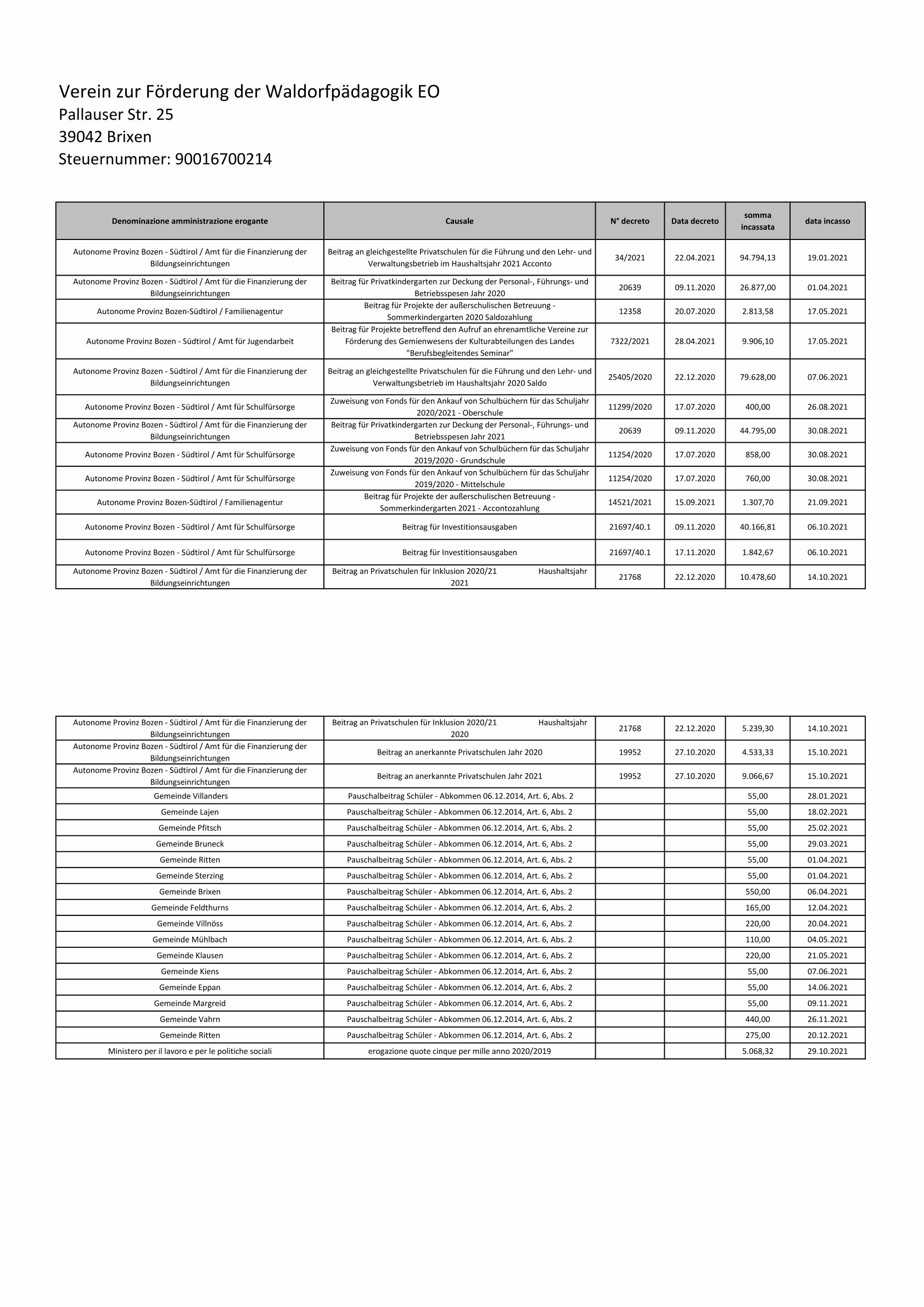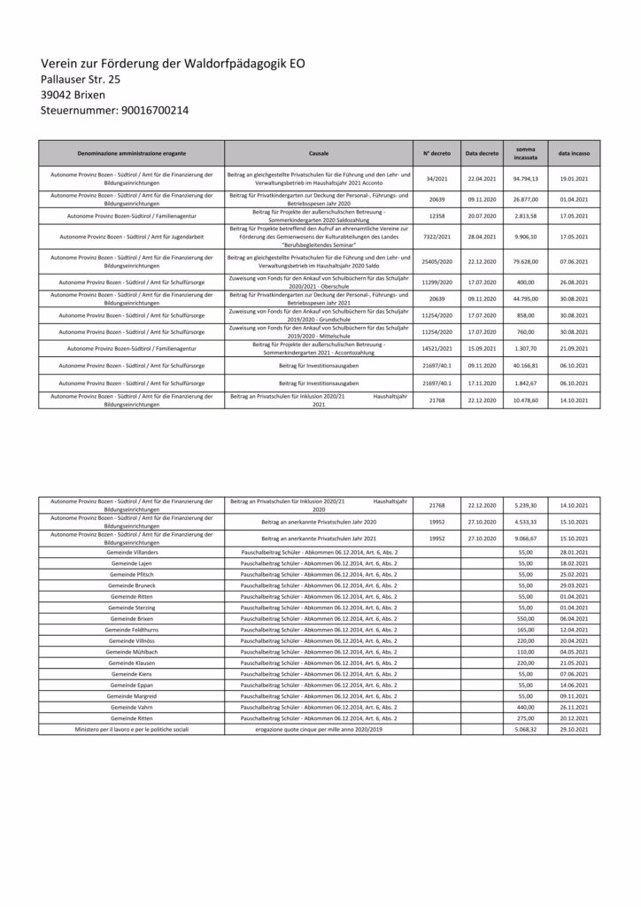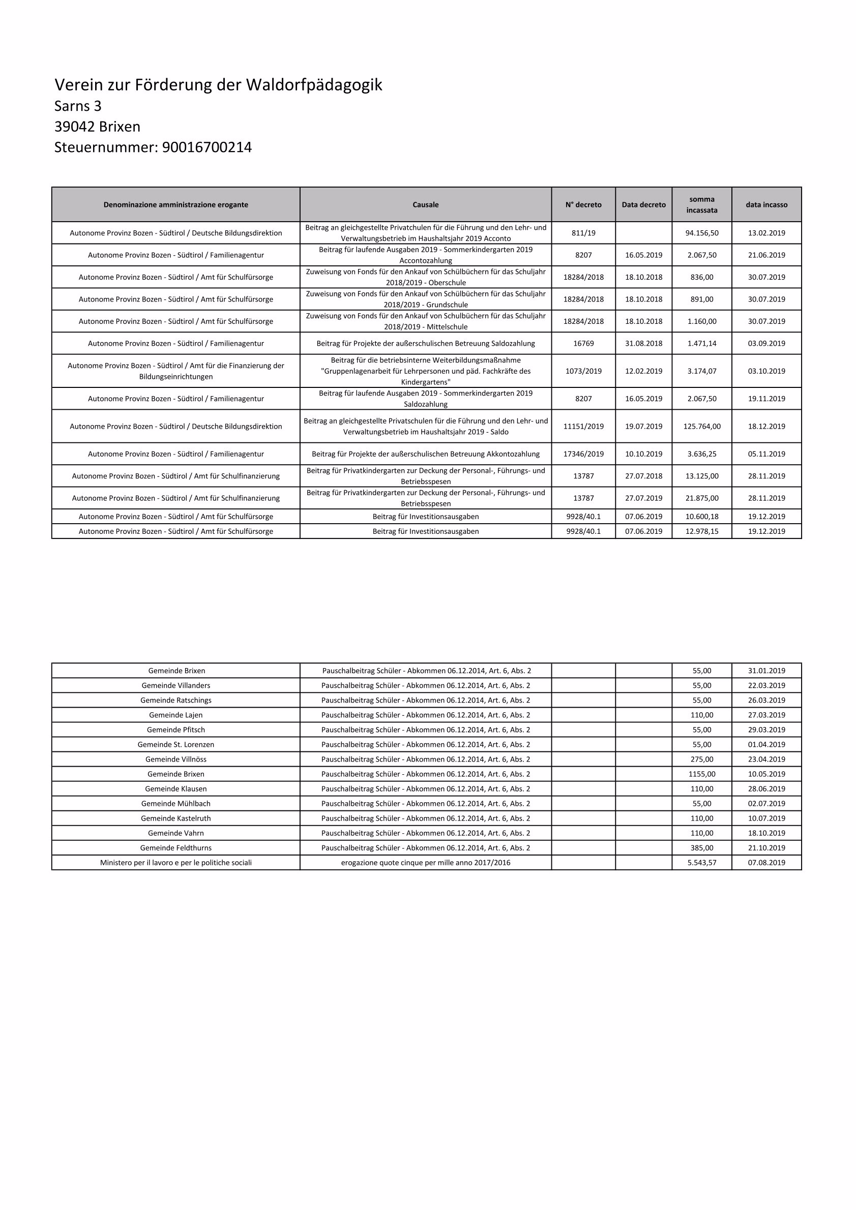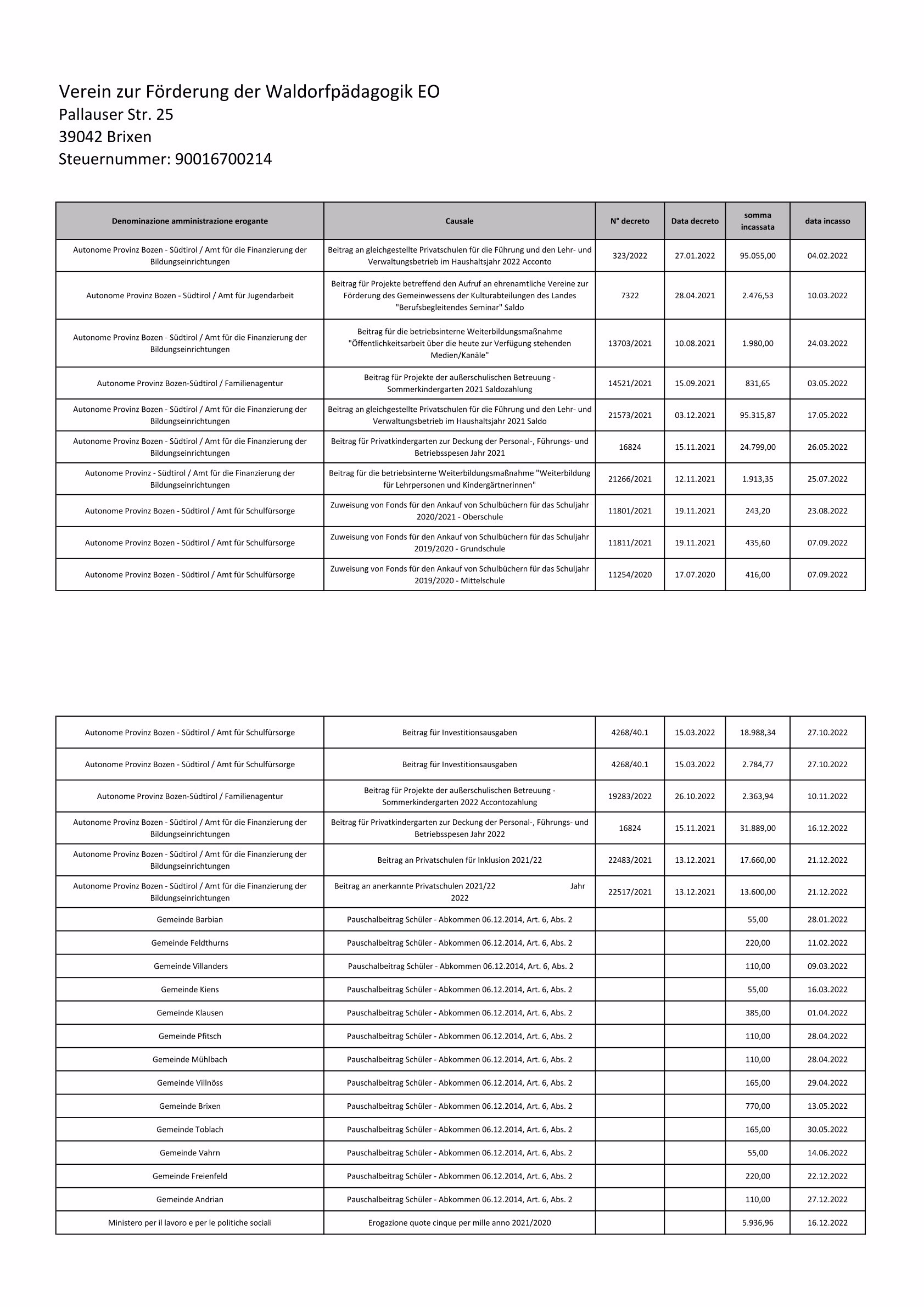 Rechtlicher Träger ist der „Verein EO zur Förderung der Waldorfpädagogik Brixen“. Er ist eingetragen in das Verzeichnis für ehrenamtlich tätige Organisationen und in das Register der juristischen Personen des Privatrechtes.
