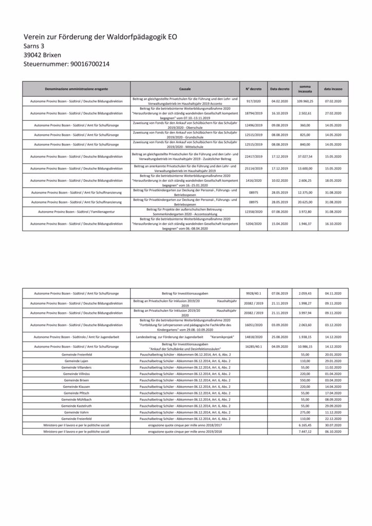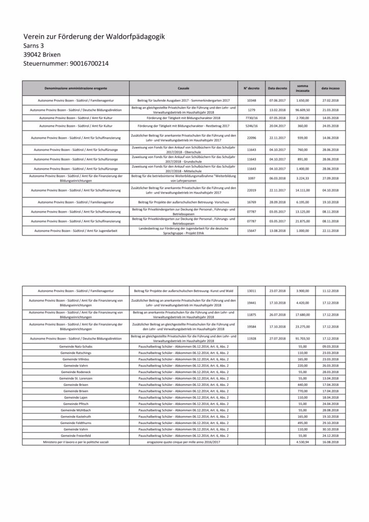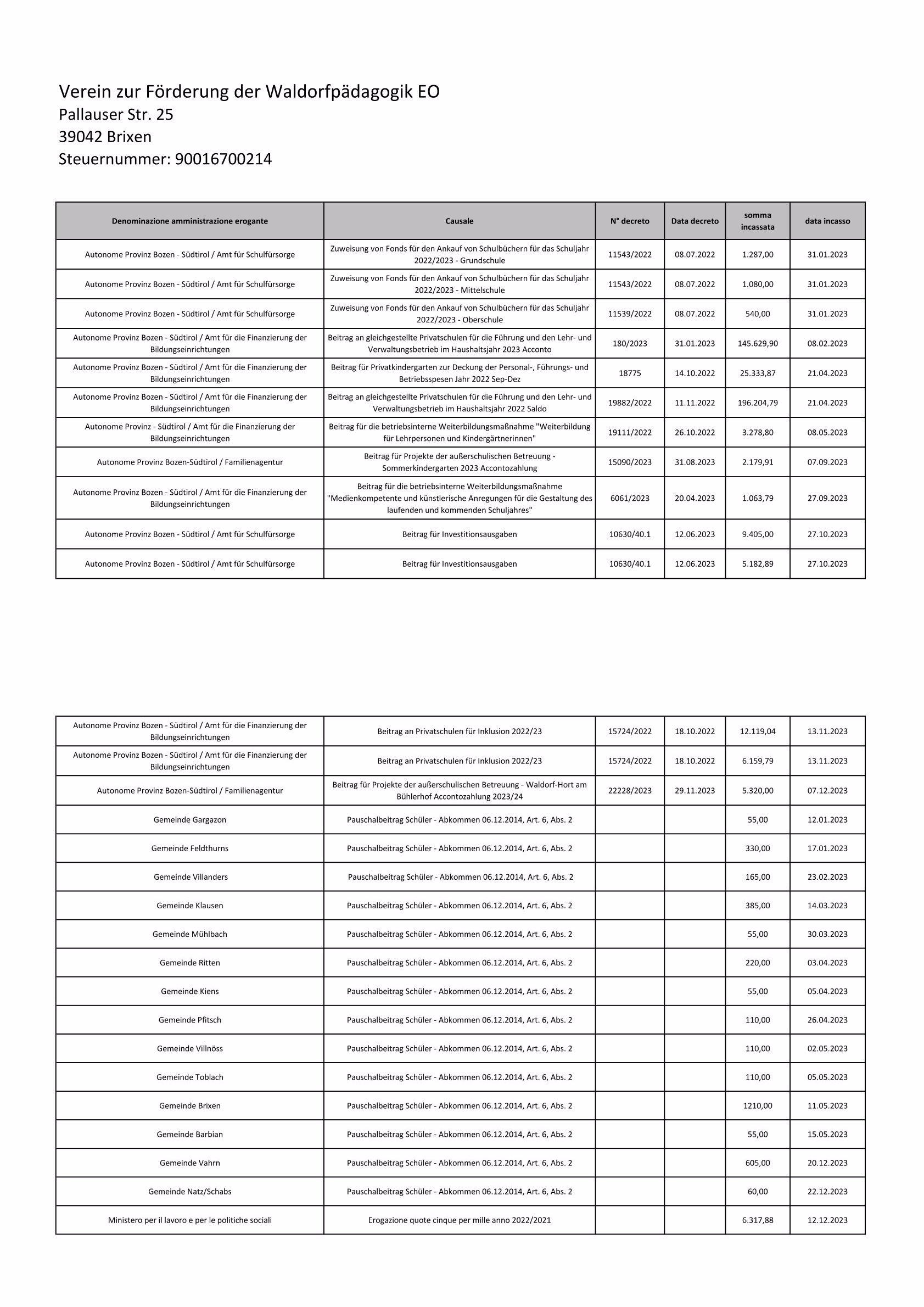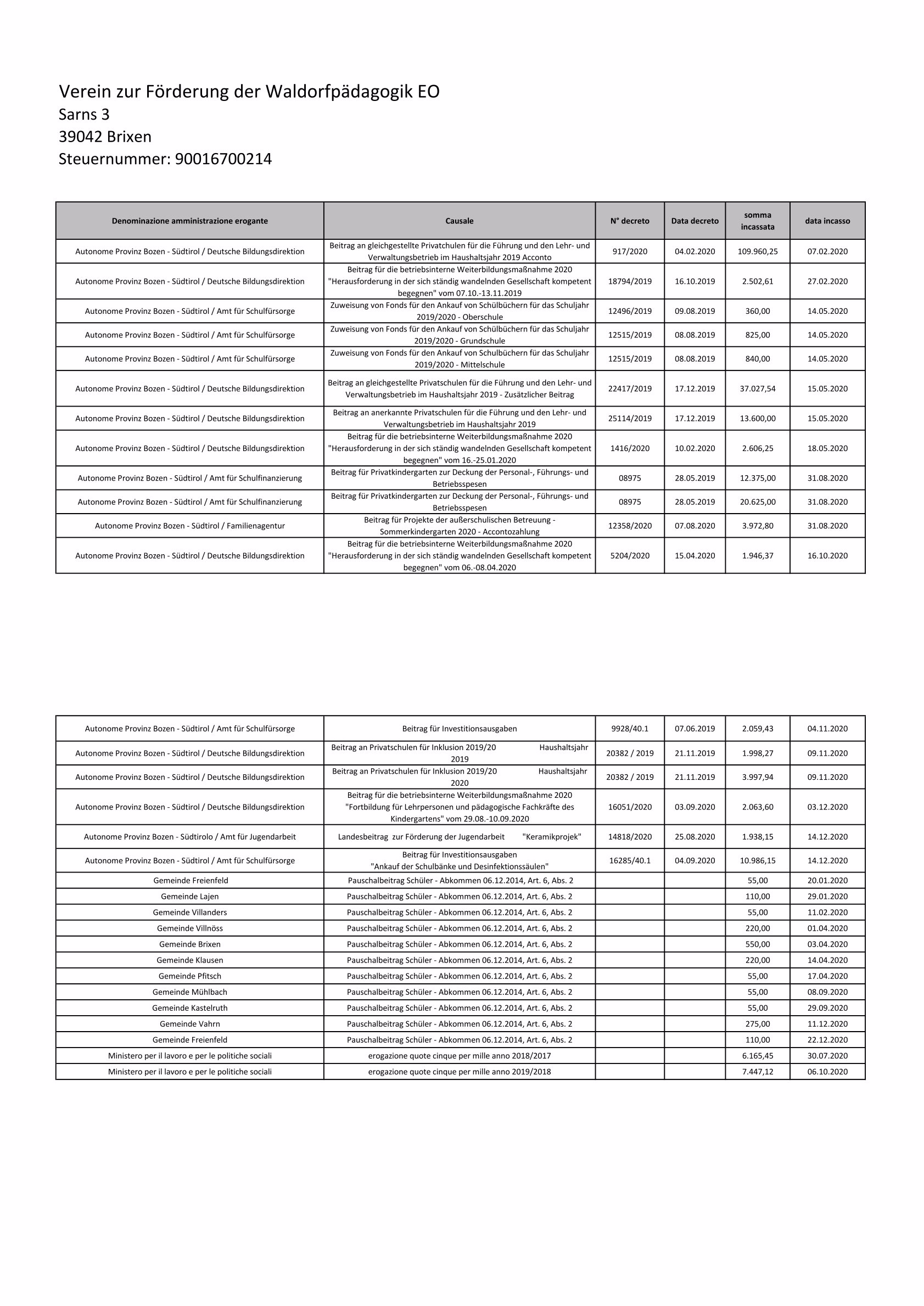 Rechtlicher Träger ist der „Verein EO zur Förderung der Waldorfpädagogik Brixen“. Er ist eingetragen in das Verzeichnis für ehrenamtlich tätige Organisationen und in das Register der juristischen Personen des Privatrechtes.